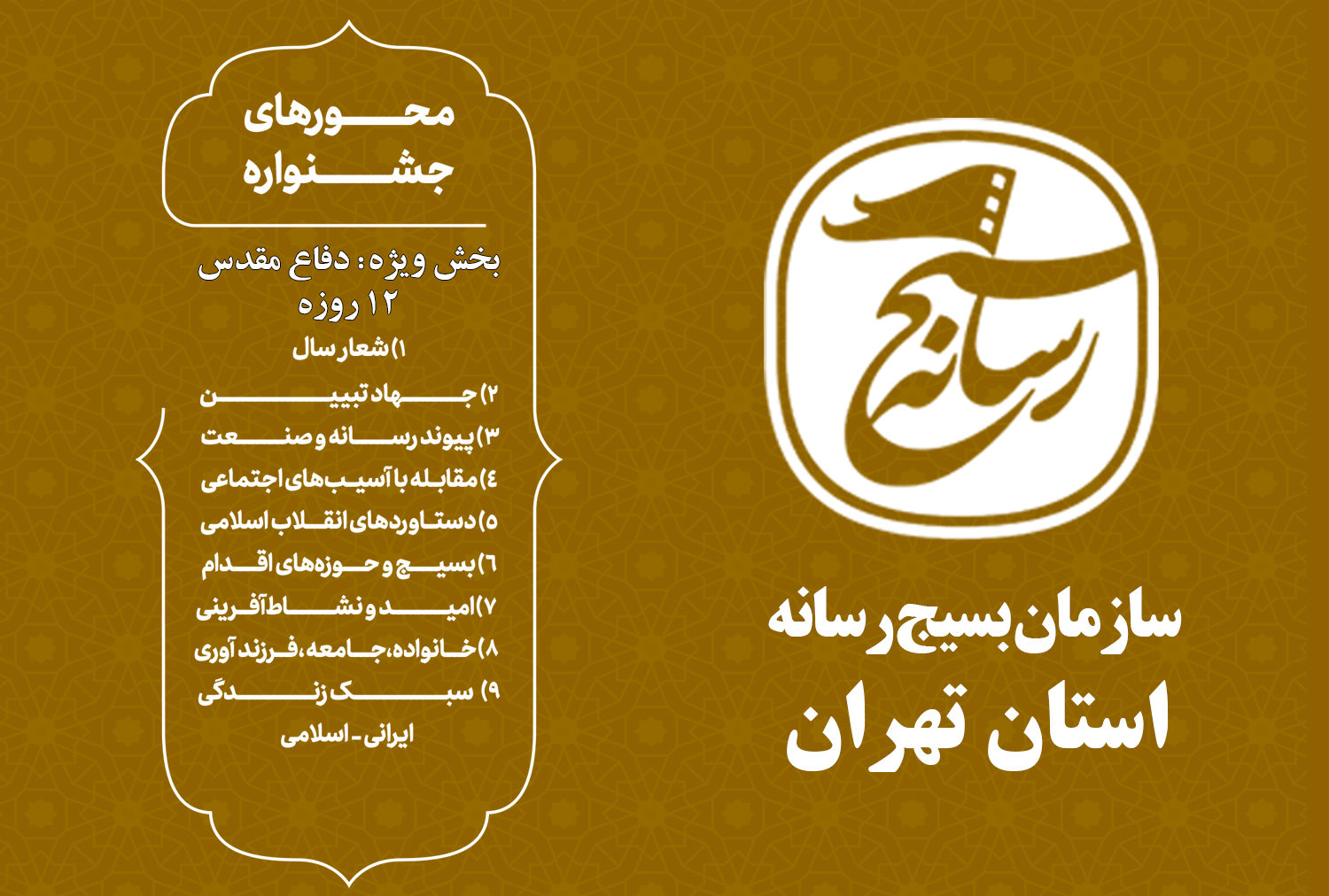 شعار سال – جهاد تبیین – پیوند رسانه و صنعت – مقابله با آسیب های اجتماعی – دستاوردهای انقلاب اسلامی – بسیج و حوزه های اقدام – امید و نشاط آفرینی – خانواده ، جامعه ، فرزند آوری